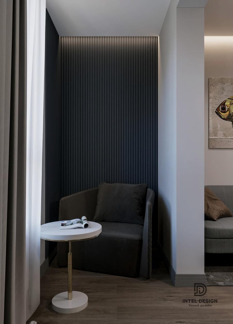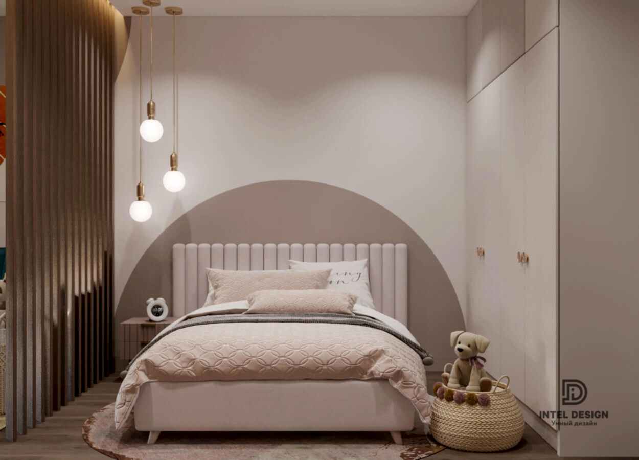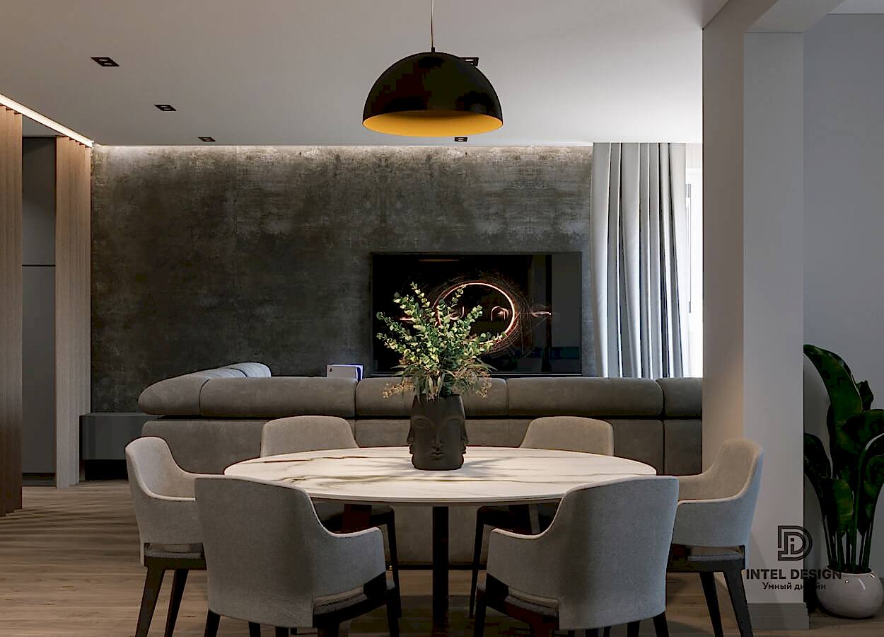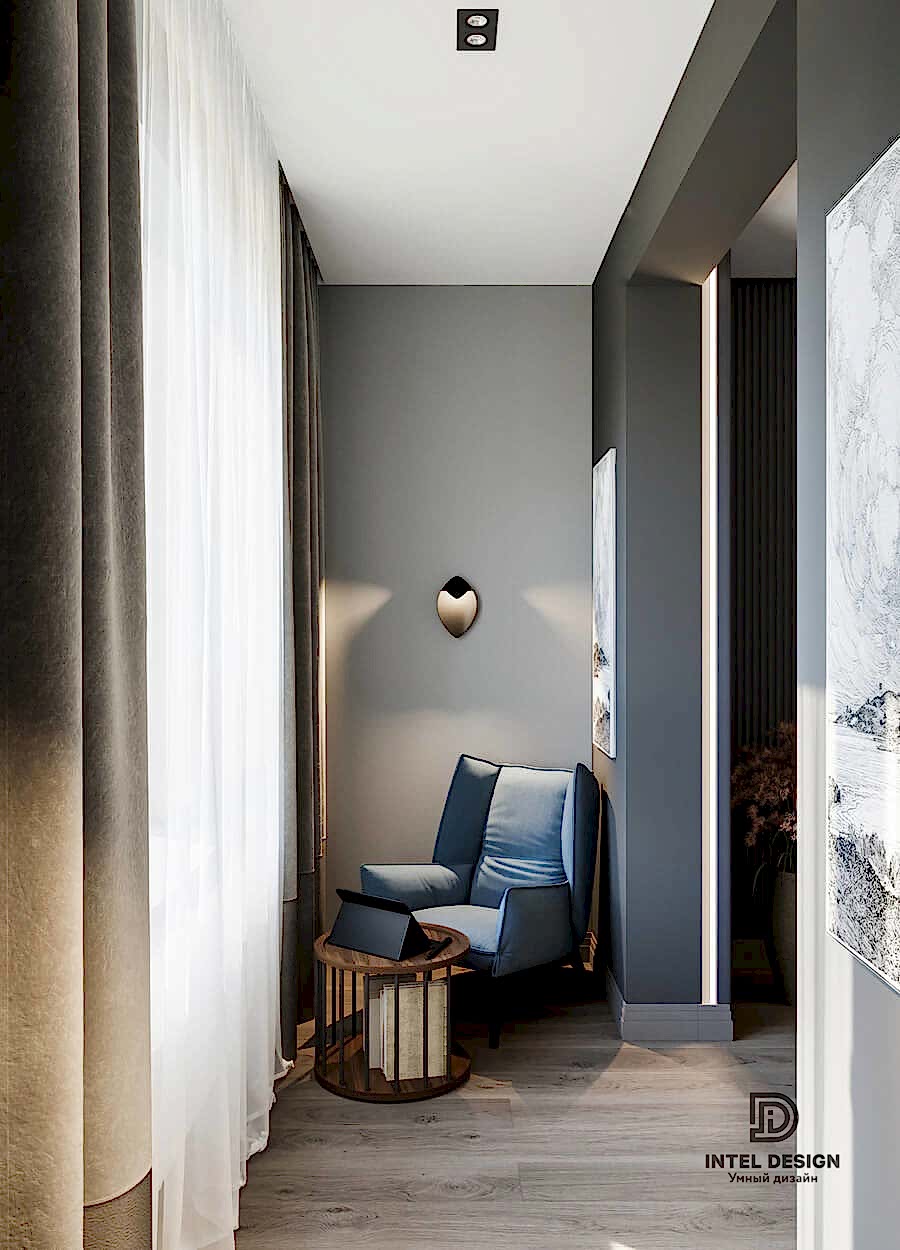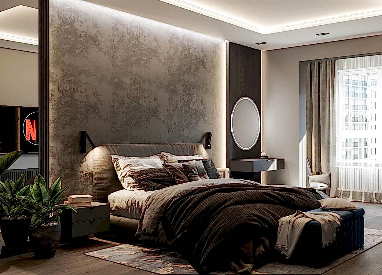 В данном проекте удалось интересно решить вопросы зонирования пространства, как в спальнях, так и в общем Pin-Up студии. В дизайне квартиры использовали сочетание светлых тонов с более темными, фактурную декоративную штукатурку.