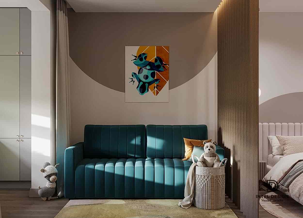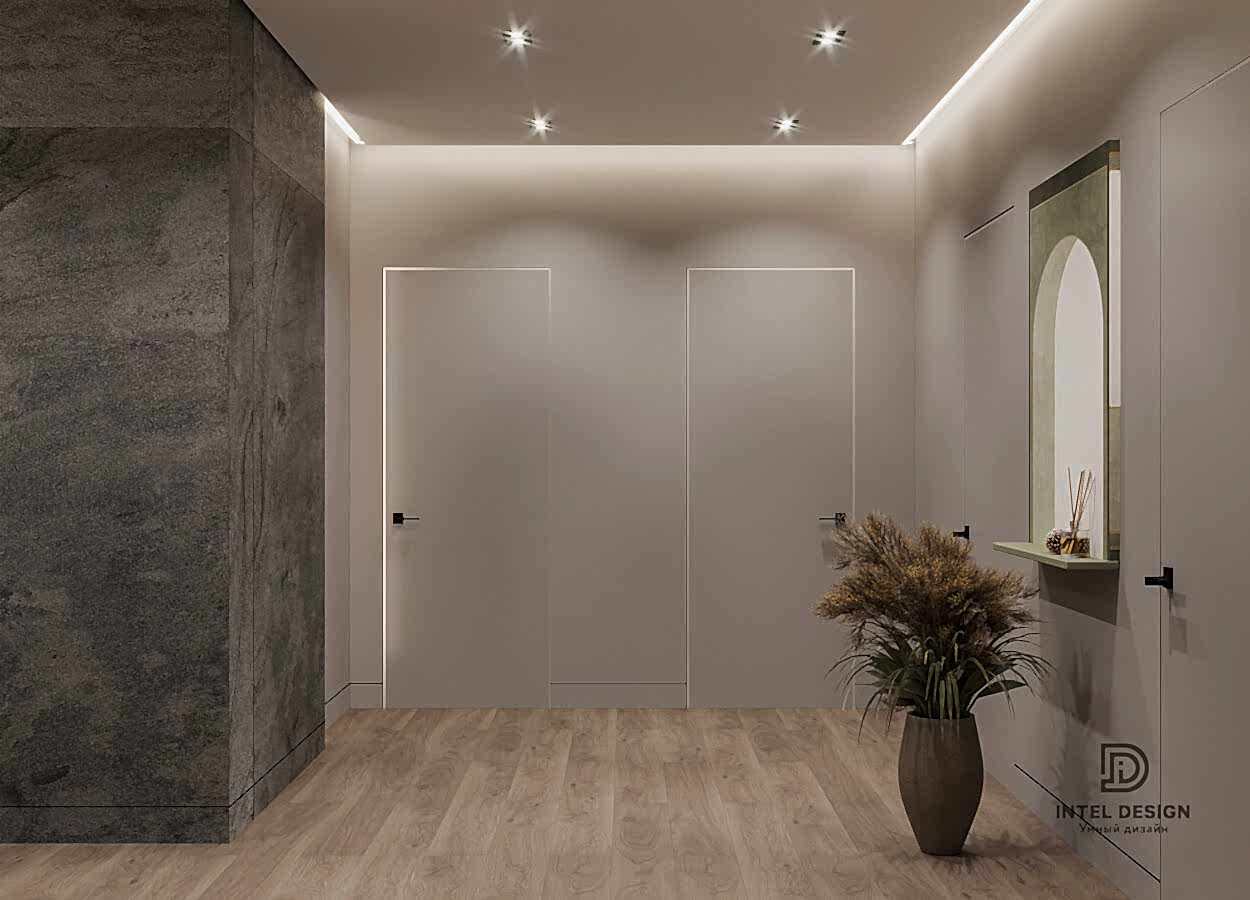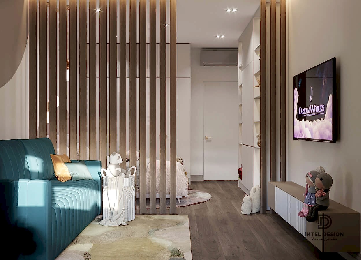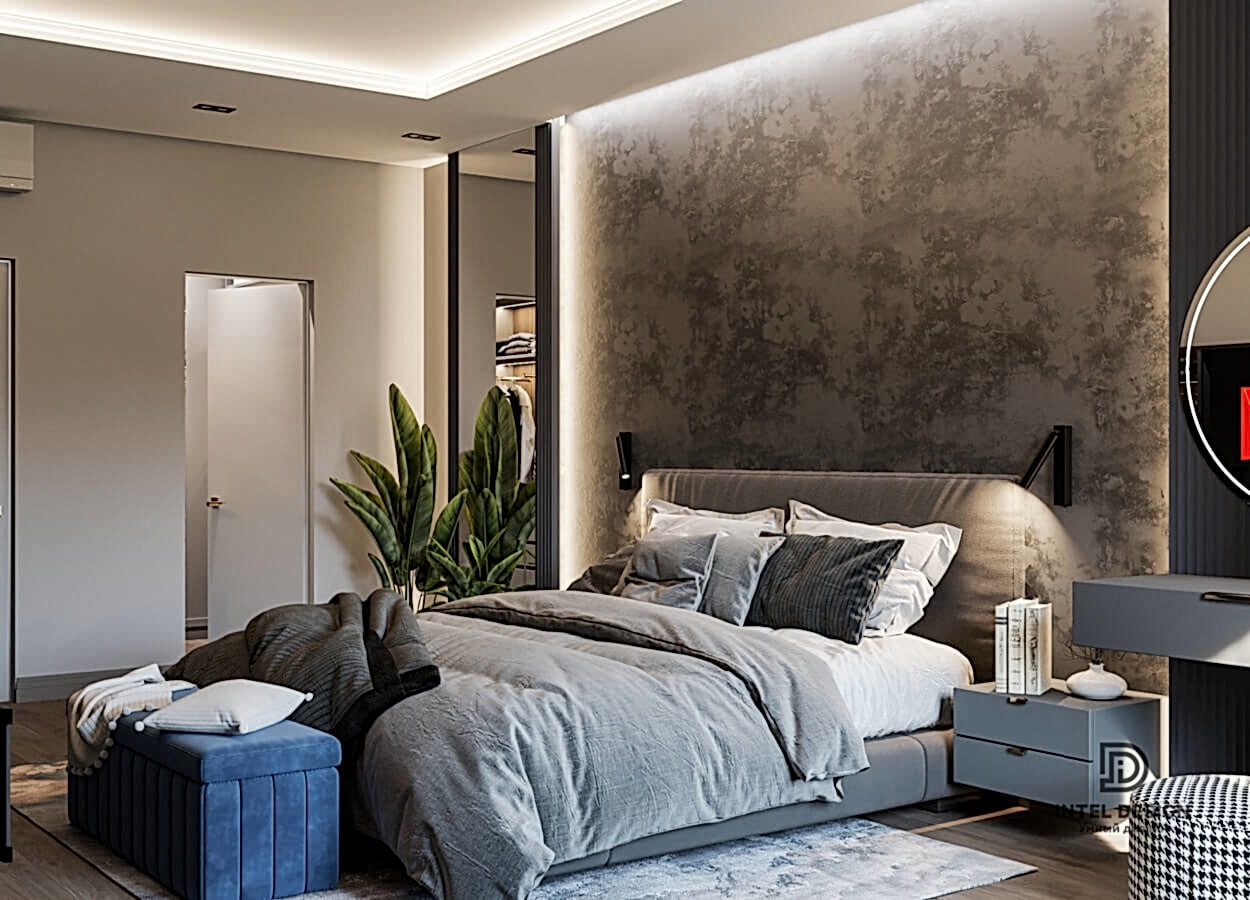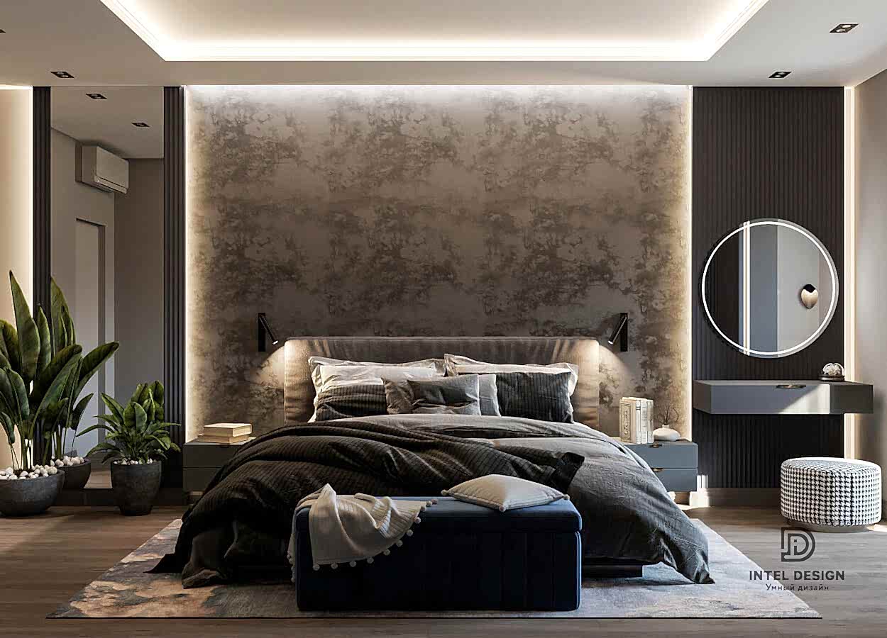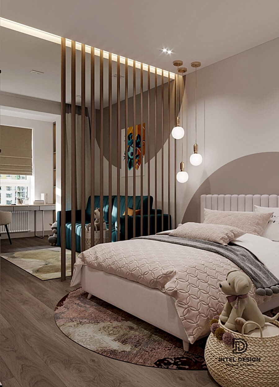 В данном проекте удалось интересно решить вопросы зонирования пространства, как в спальнях, так и в общем Pin-Up студии. В дизайне квартиры использовали сочетание светлых тонов с более темными, фактурную декоративную штукатурку.