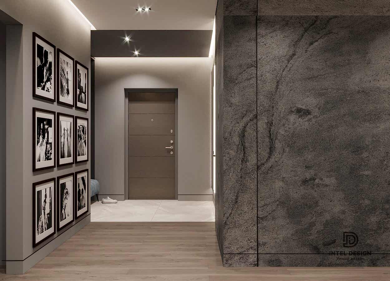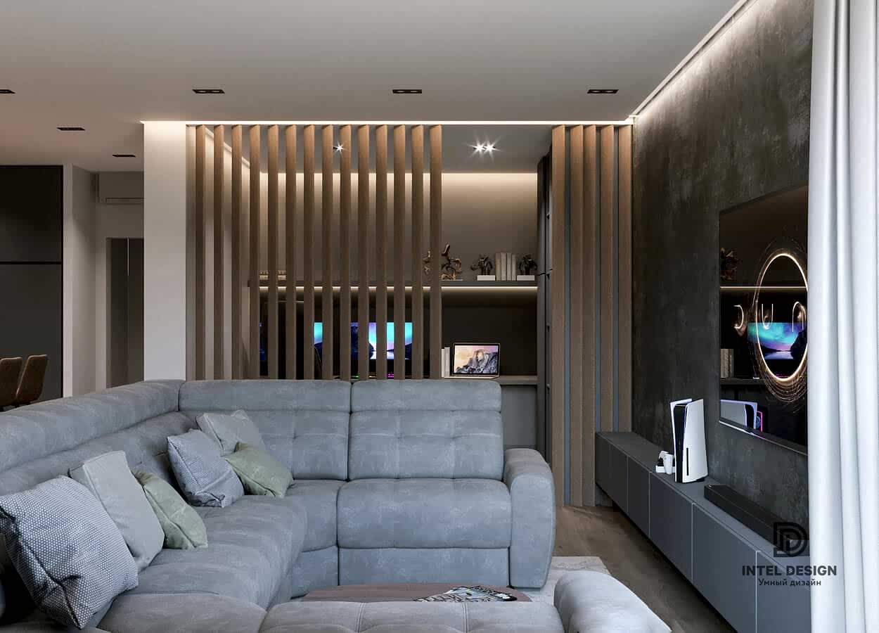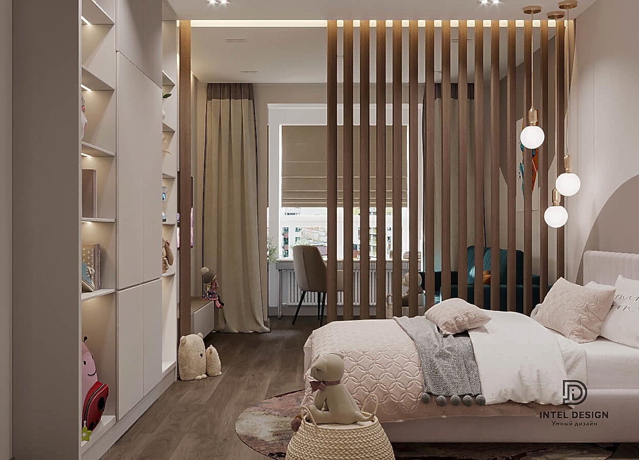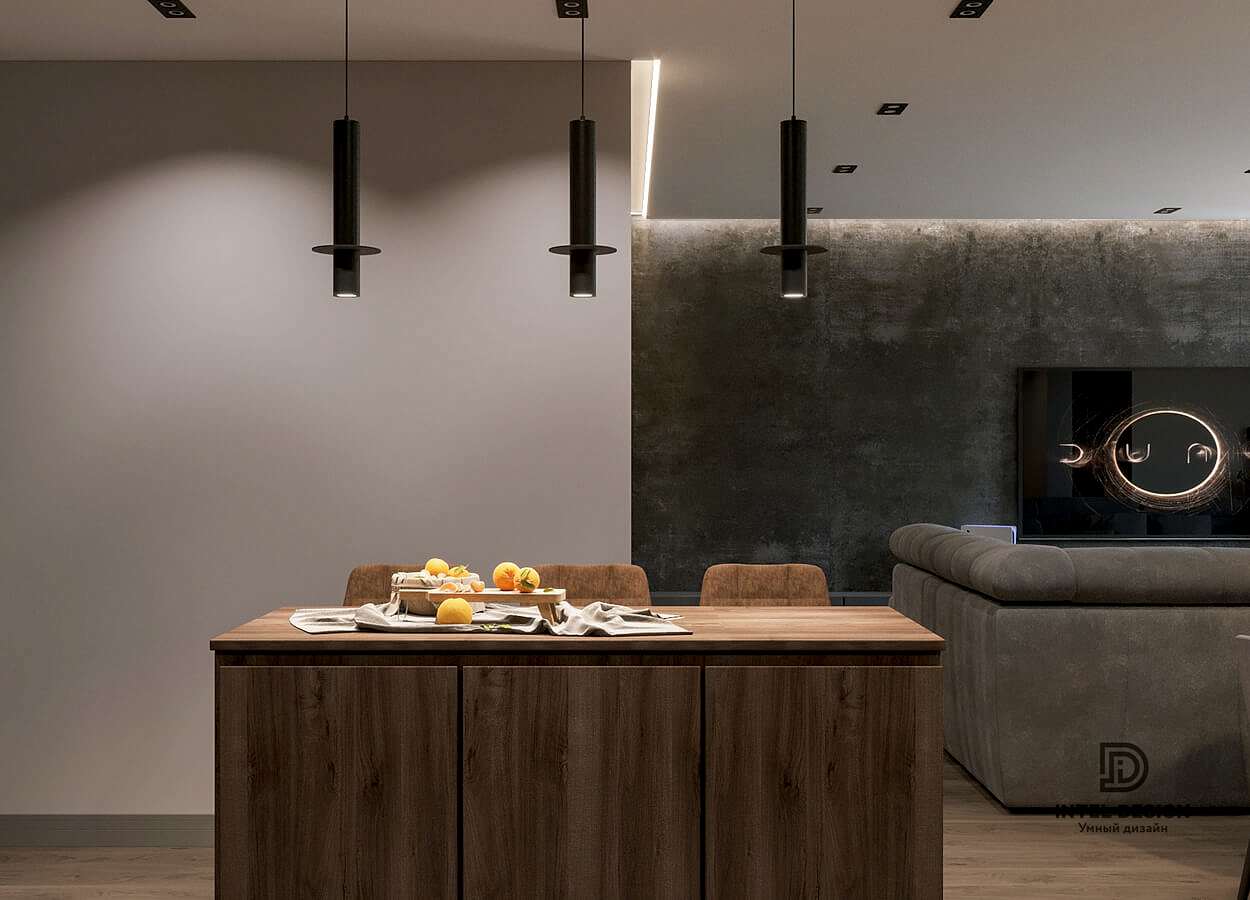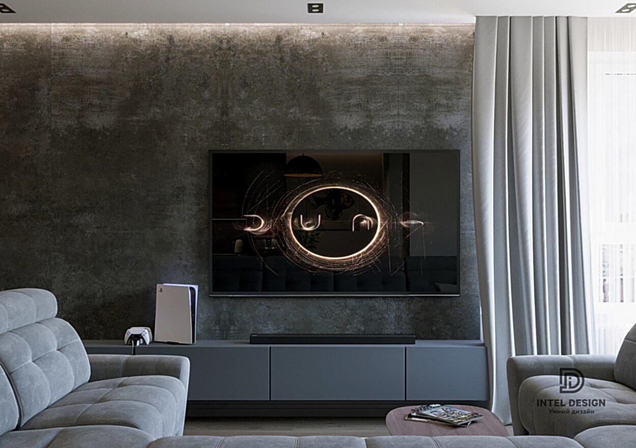 В данном проекте удалось интересно решить вопросы зонирования пространства, как в спальнях, так и в общем Pin-Up студии. В дизайне квартиры использовали сочетание светлых тонов с более темными, фактурную декоративную штукатурку.