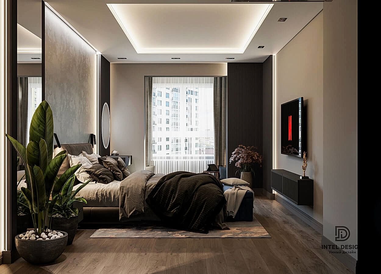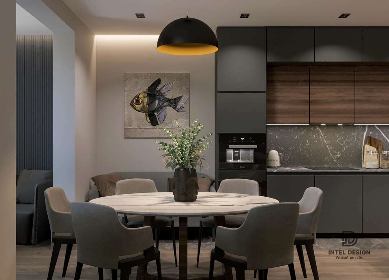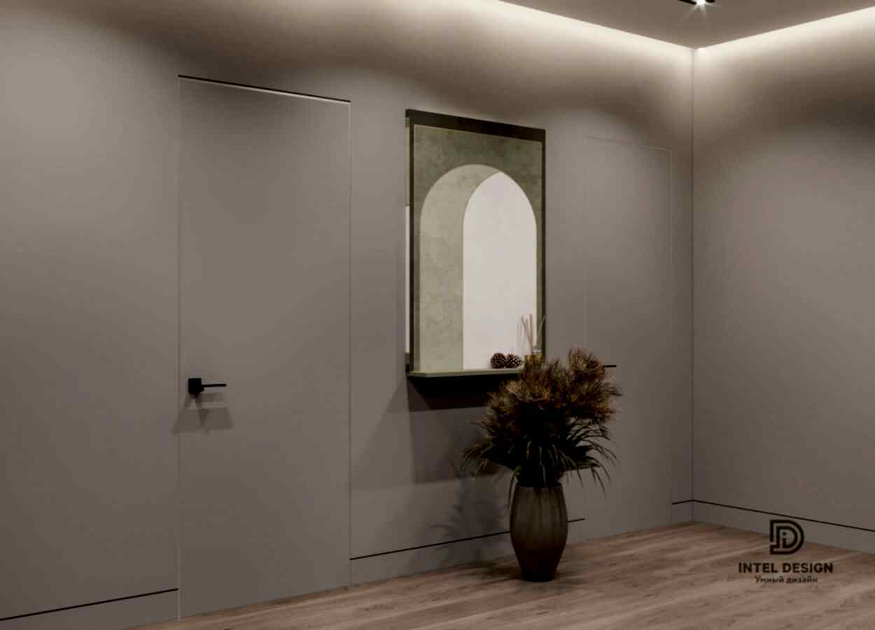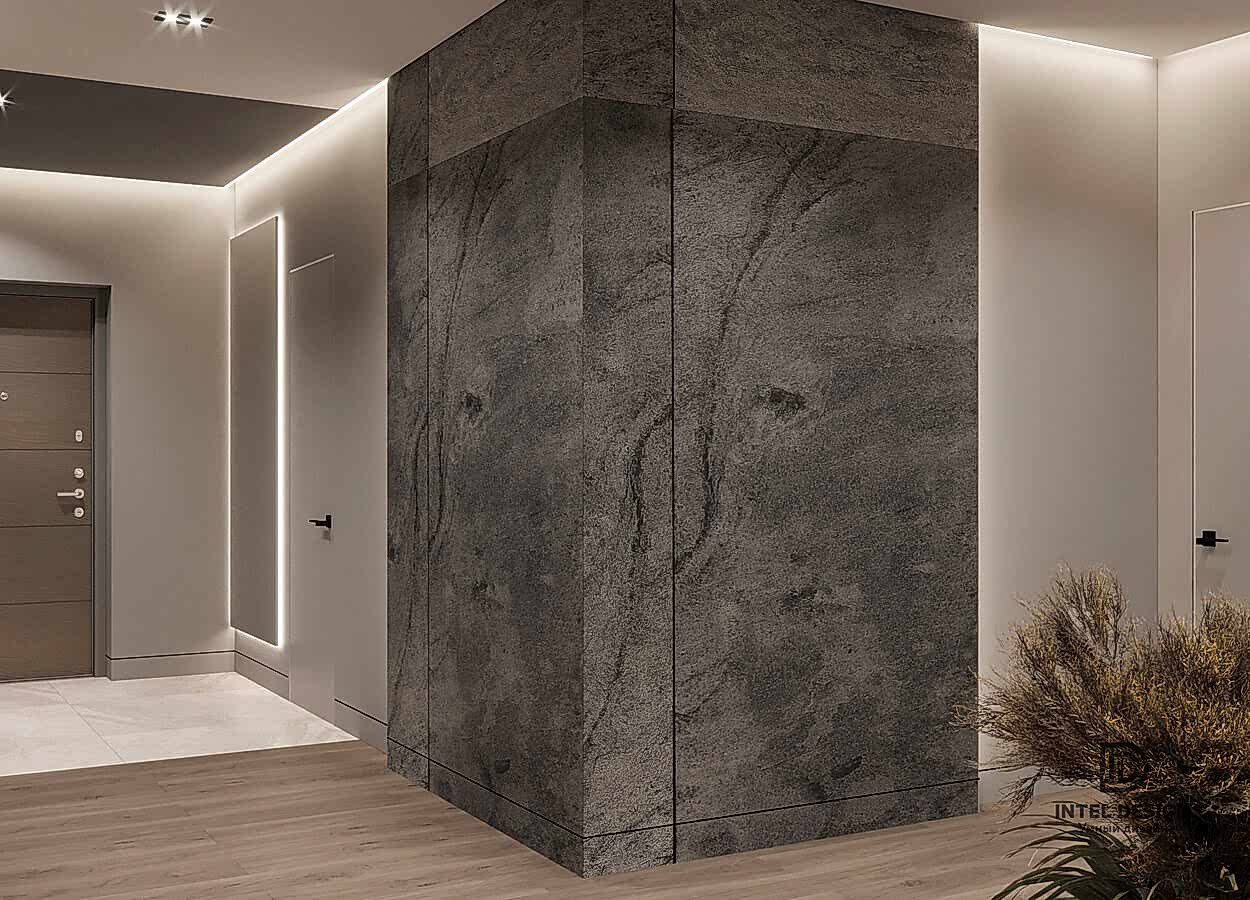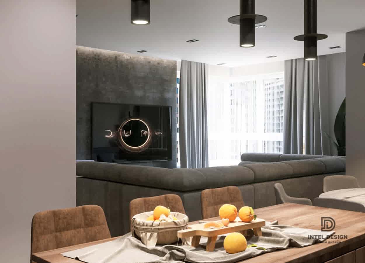 В данном проекте удалось интересно решить вопросы зонирования пространства, как в спальнях, так и в общем Pin-Up студии. В дизайне квартиры использовали сочетание светлых тонов с более темными, фактурную декоративную штукатурку.