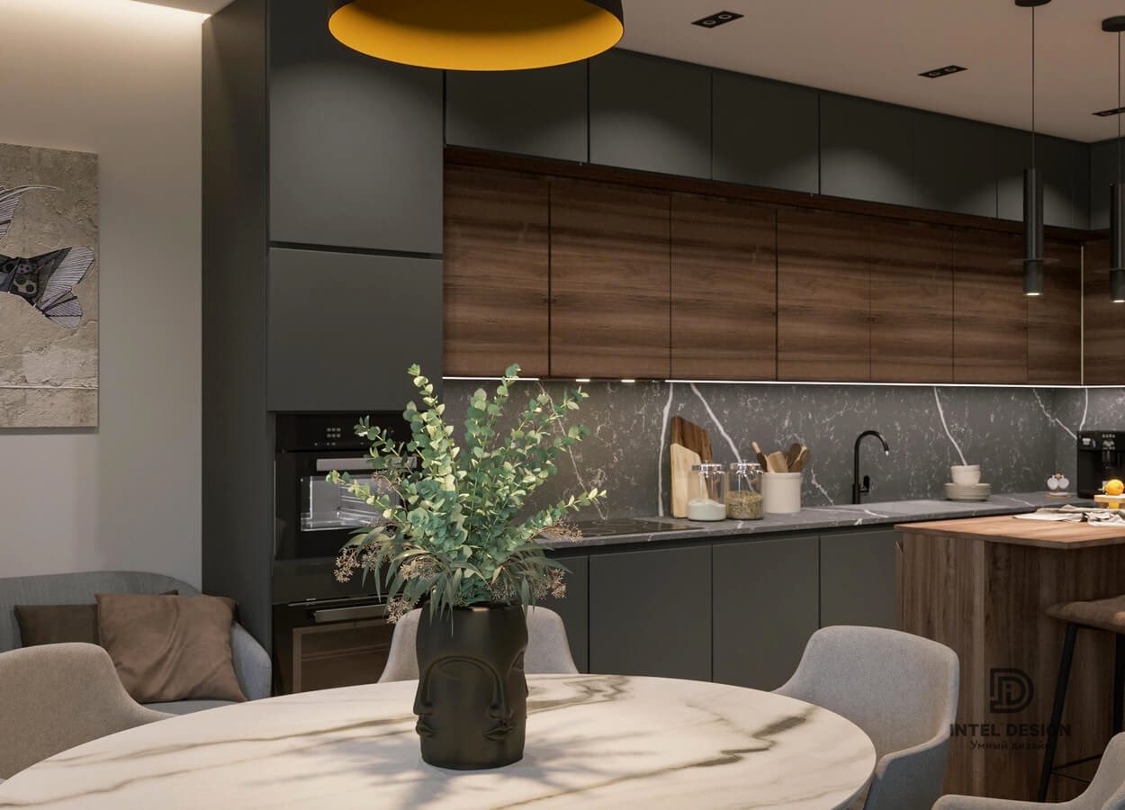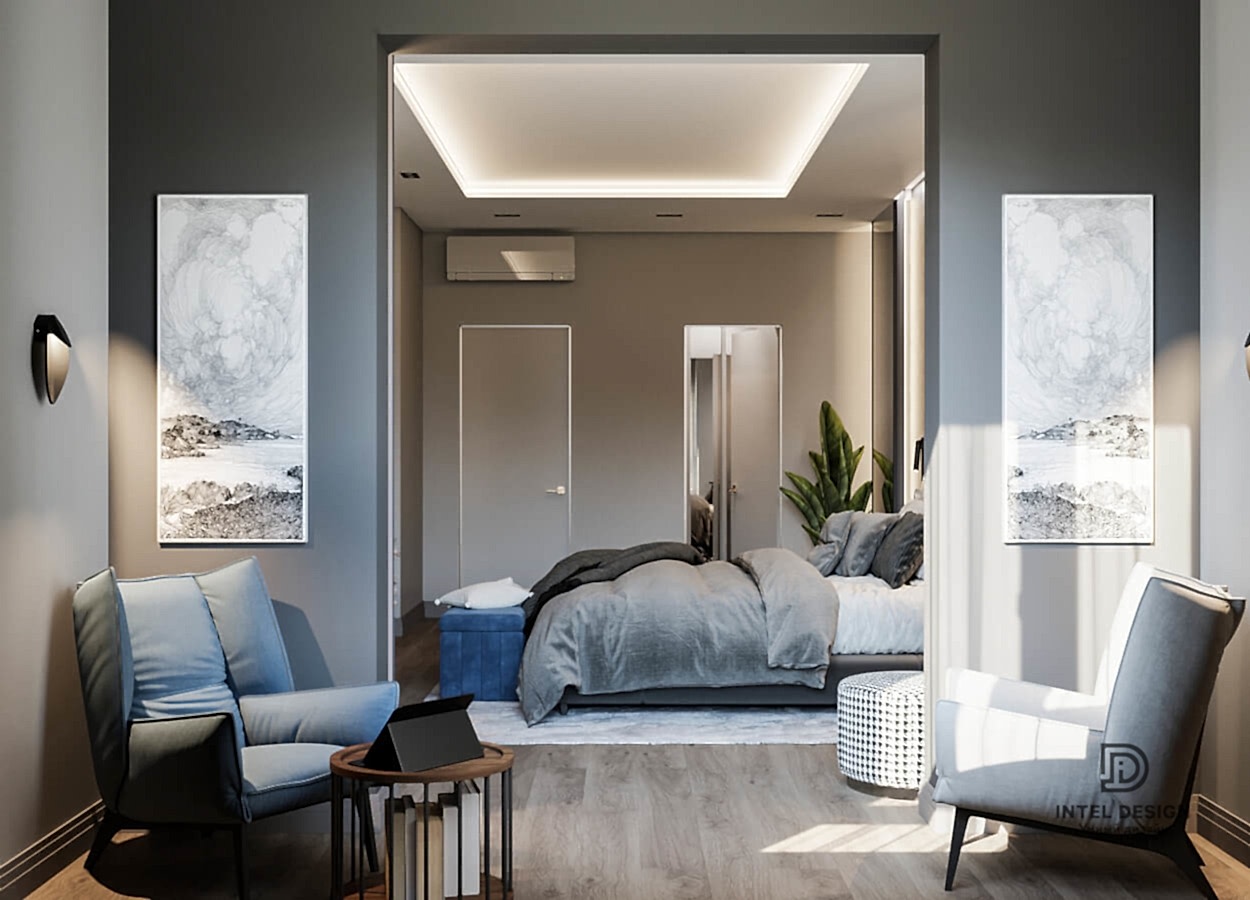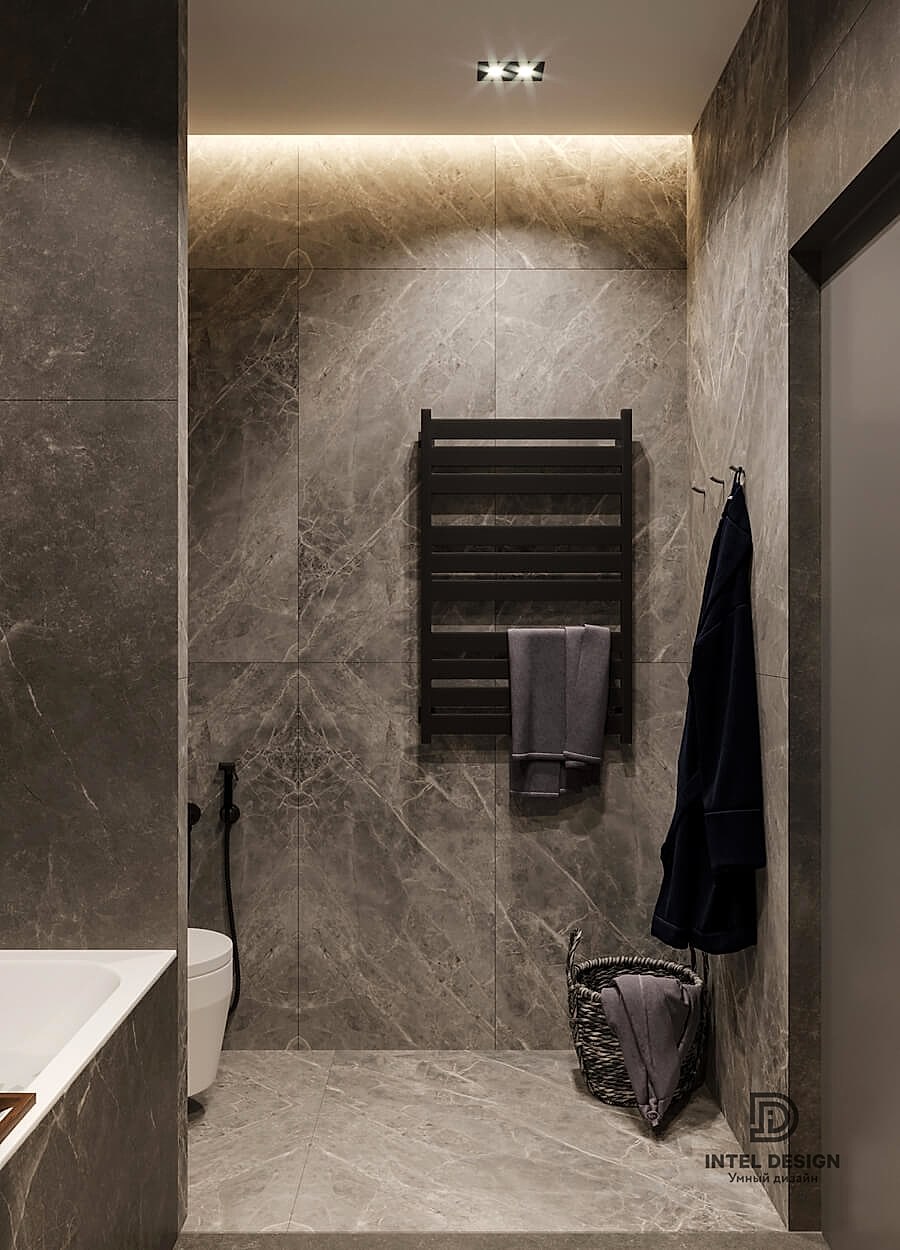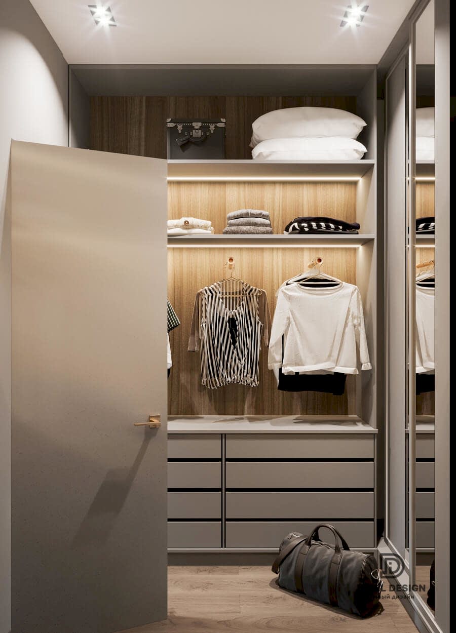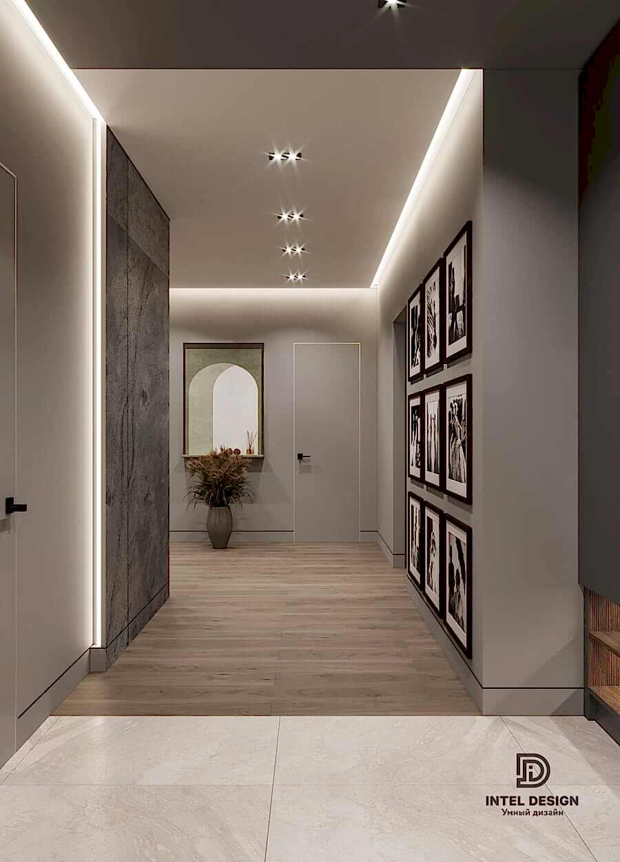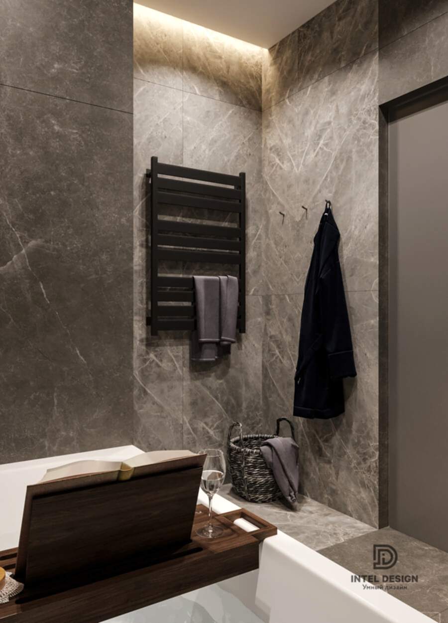В данном проекте удалось интересно решить вопросы зонирования пространства, как в спальнях, так и в общем Pin-Up студии. В дизайне квартиры использовали сочетание светлых тонов с более темными, фактурную декоративную штукатурку.
