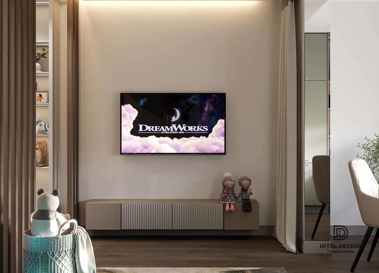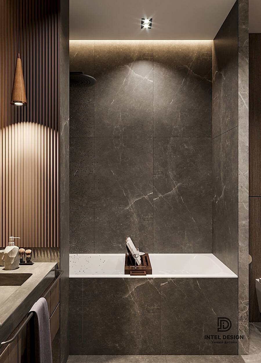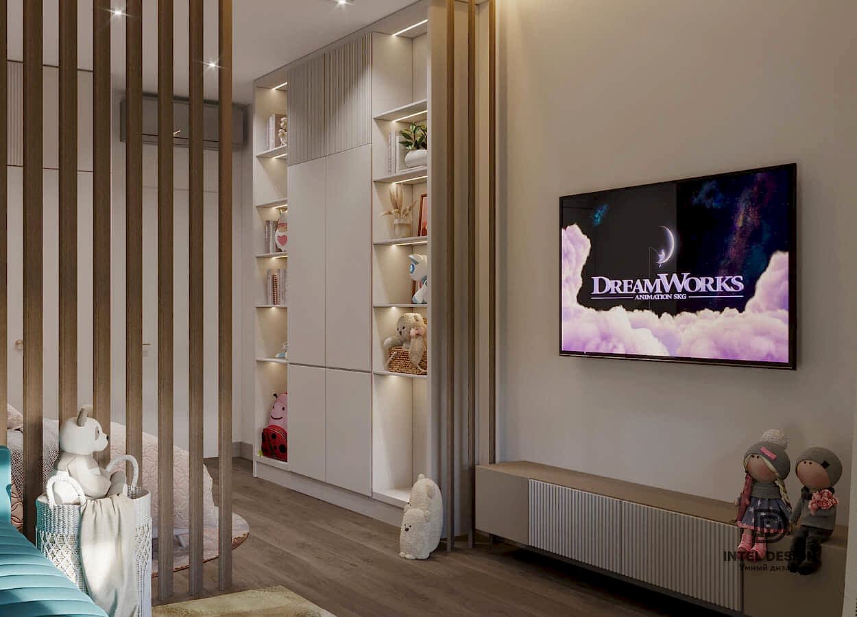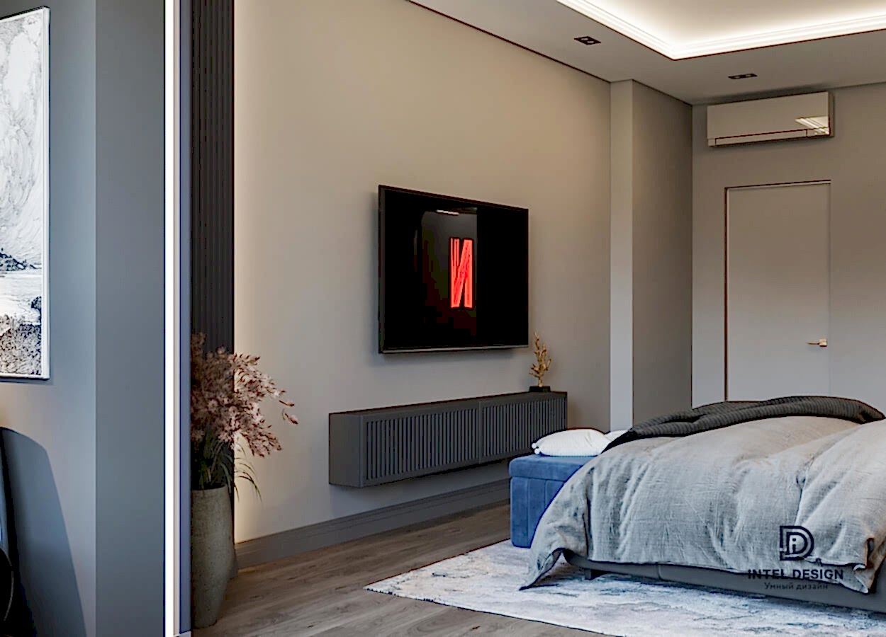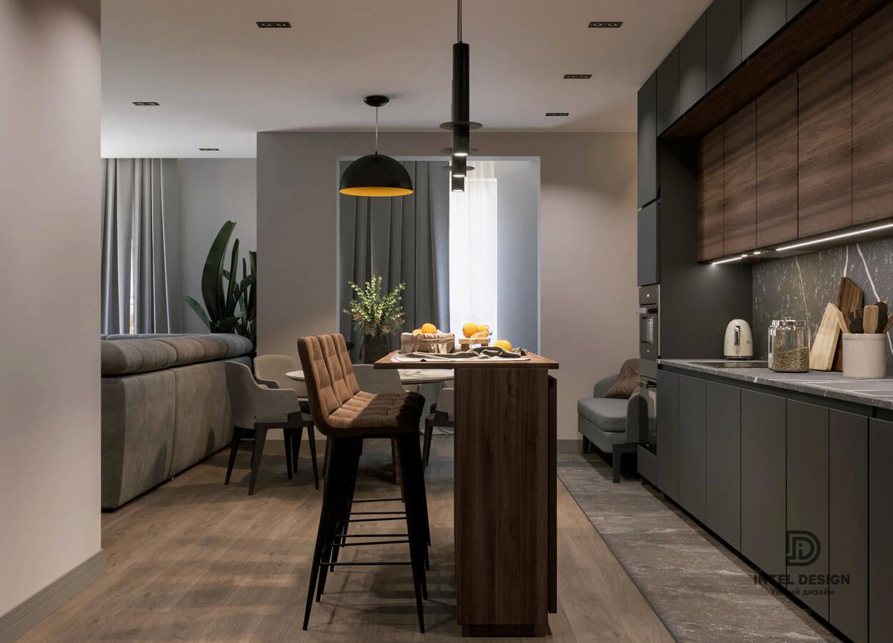 В данном проекте удалось интересно решить вопросы зонирования пространства, как в спальнях, так и в общем Pin-Up студии. В дизайне квартиры использовали сочетание светлых тонов с более темными, фактурную декоративную штукатурку.