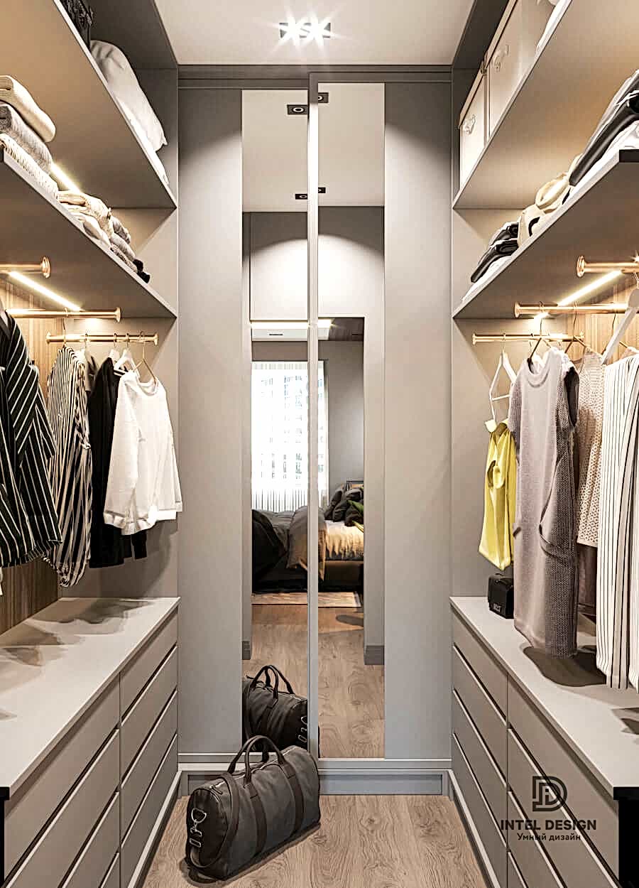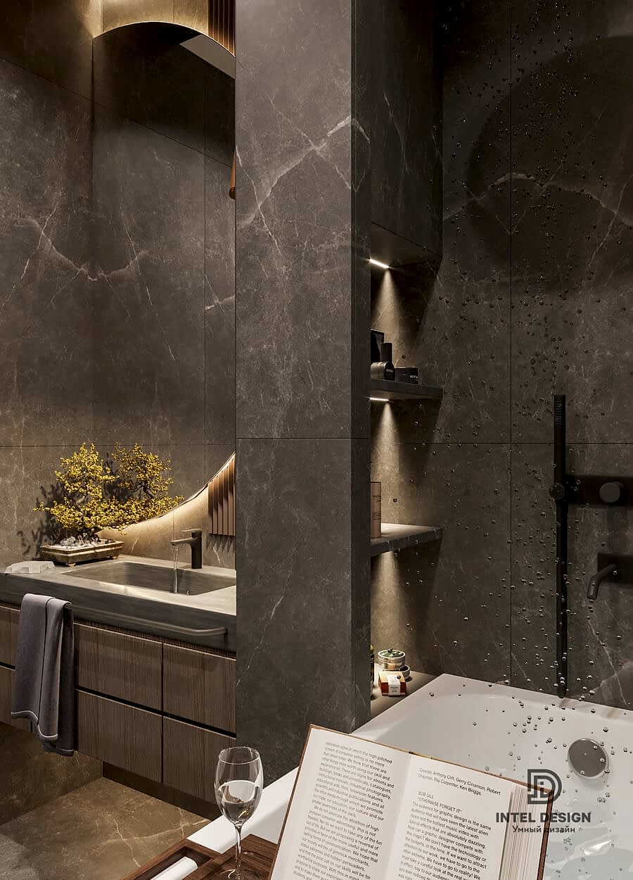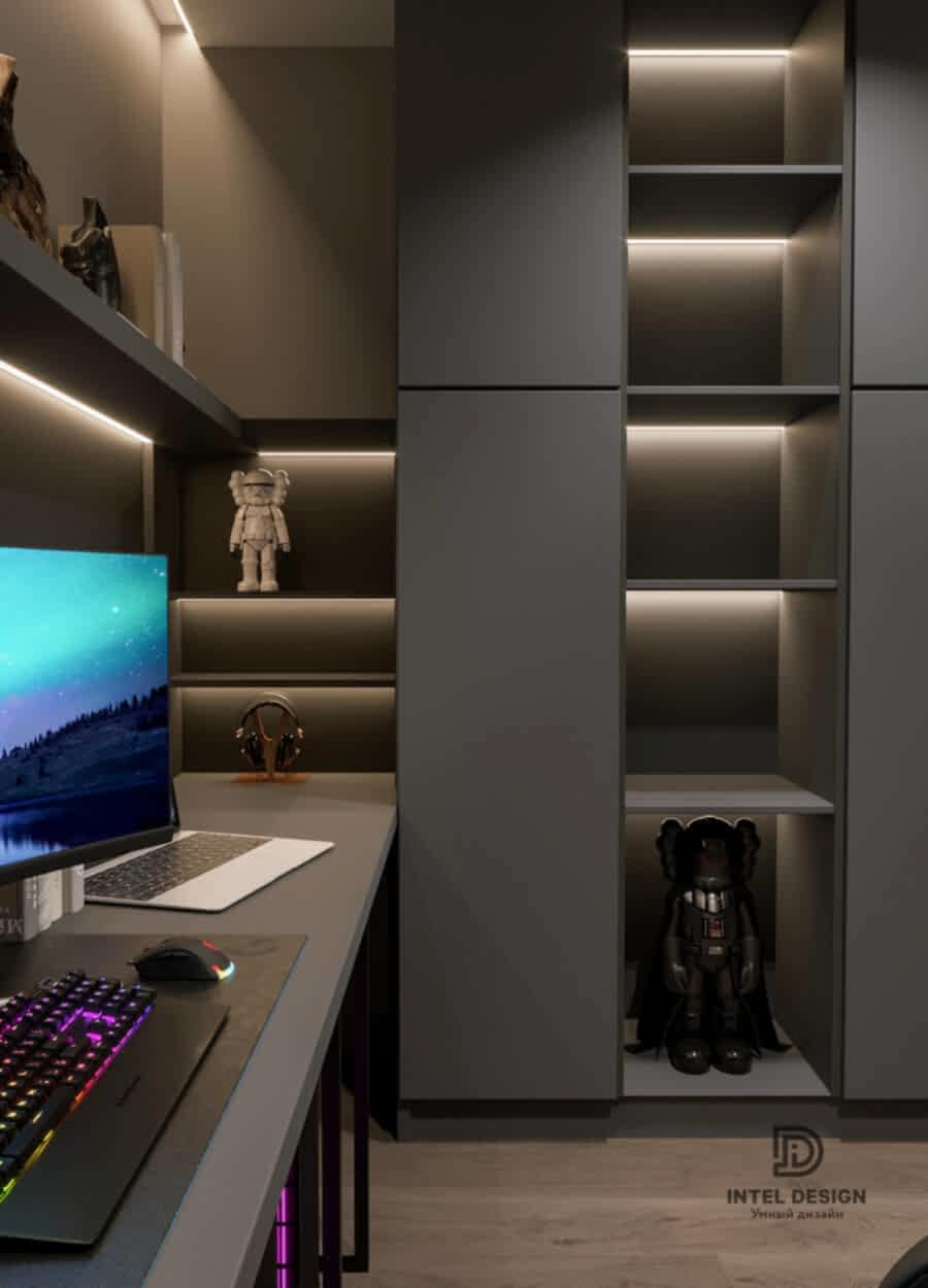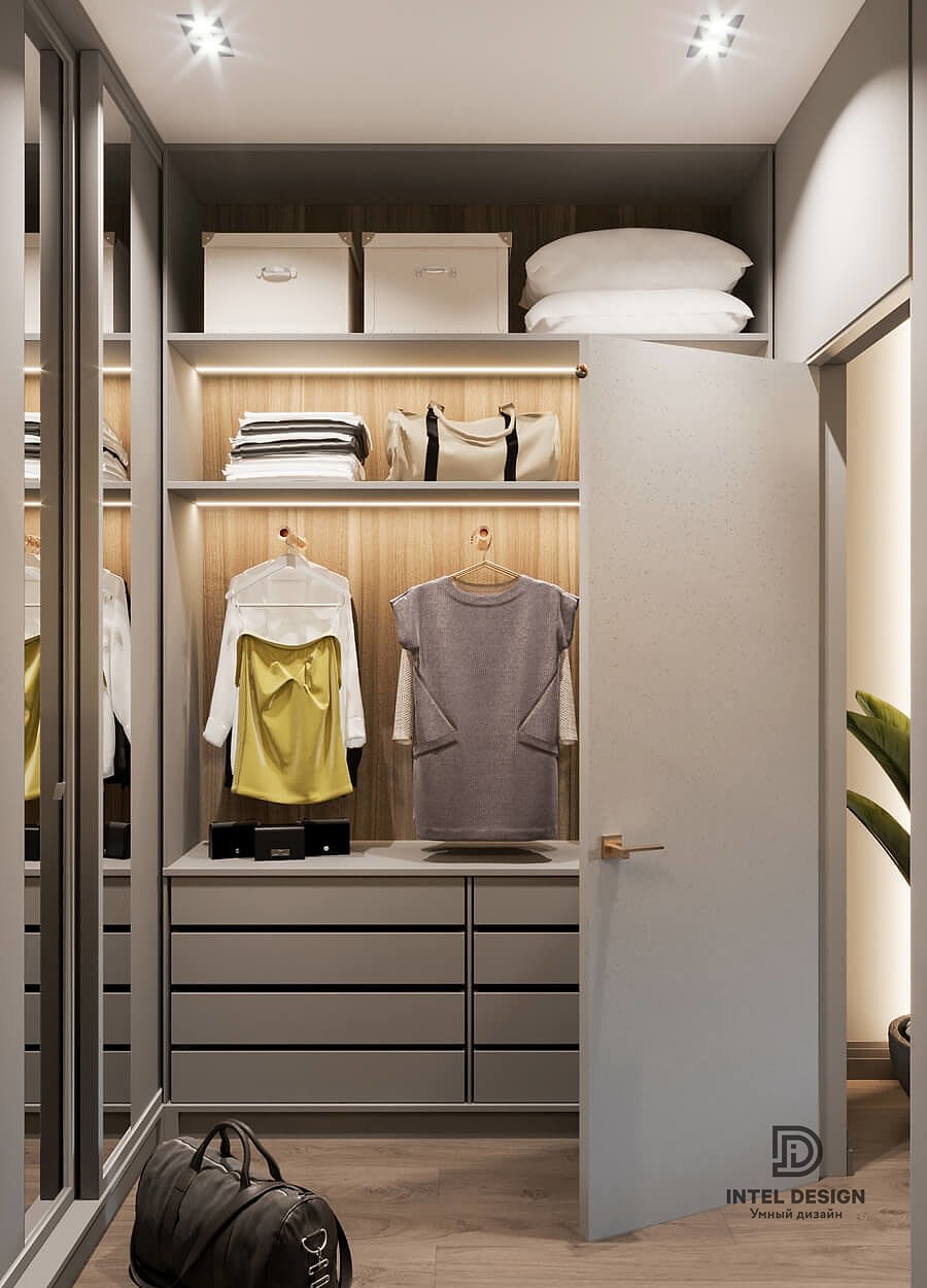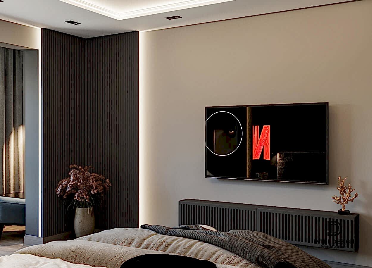 В данном проекте удалось интересно решить вопросы зонирования пространства, как в спальнях, так и в общем Pin-Up студии. В дизайне квартиры использовали сочетание светлых тонов с более темными, фактурную декоративную штукатурку.