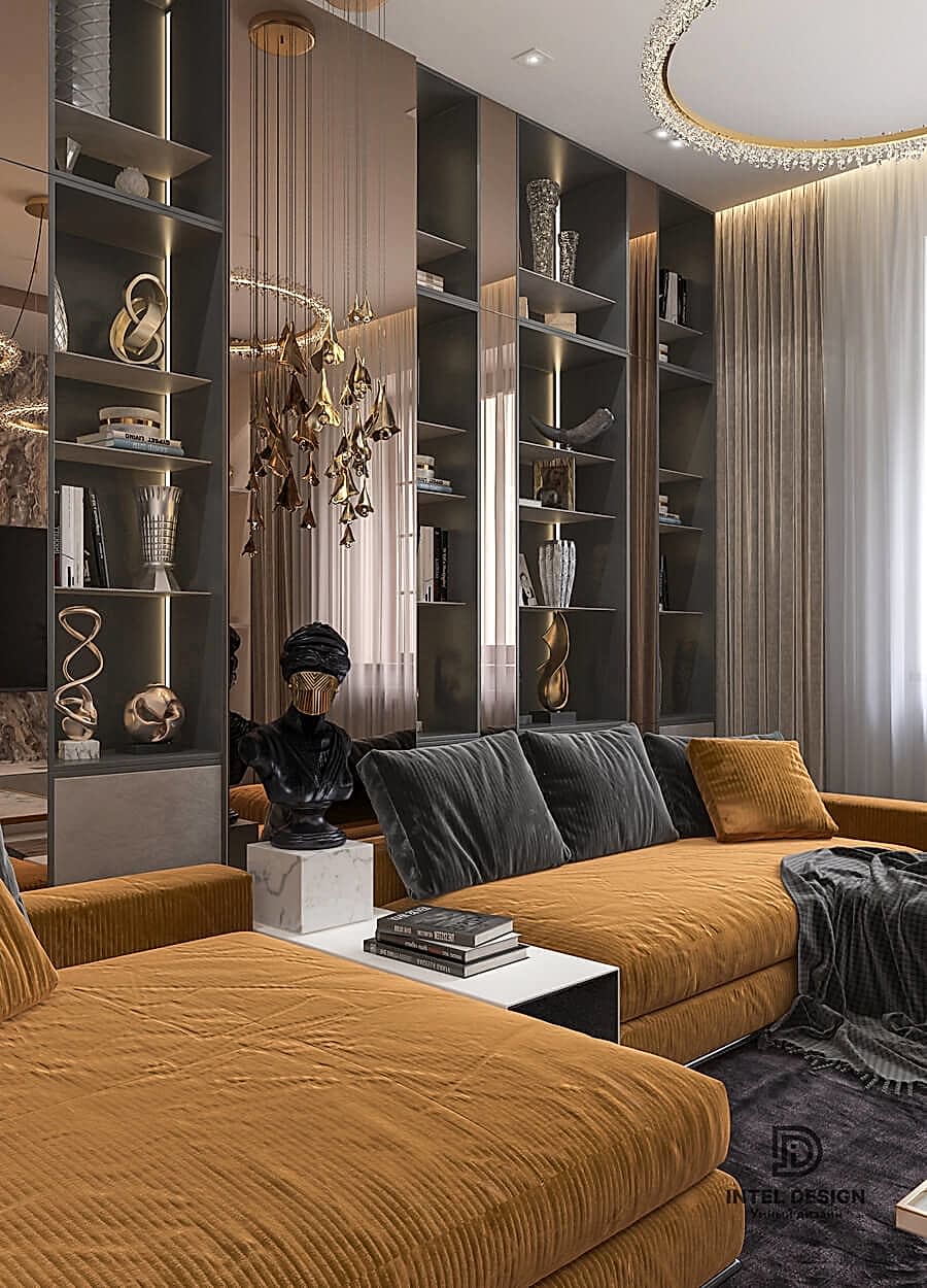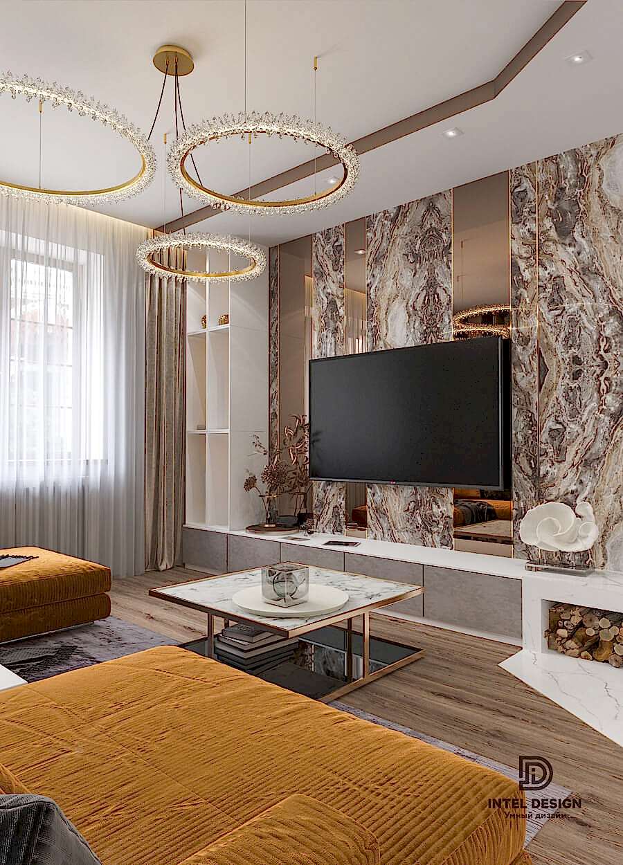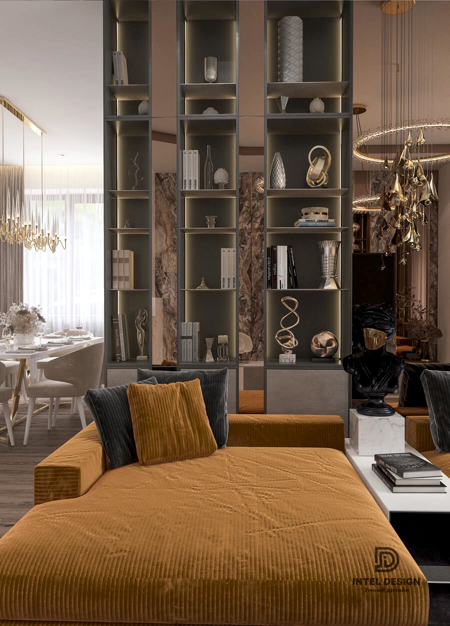 Благодаря Pin-Up глянцевым фактурам, зеркалам, эффектным люстрам и латунным деталям удалось создать торжественное настроение в интерьере. А с помощью бархатистого текстиля получилось сгладить атмосферу и придать этой торжественности домашнего уюта.