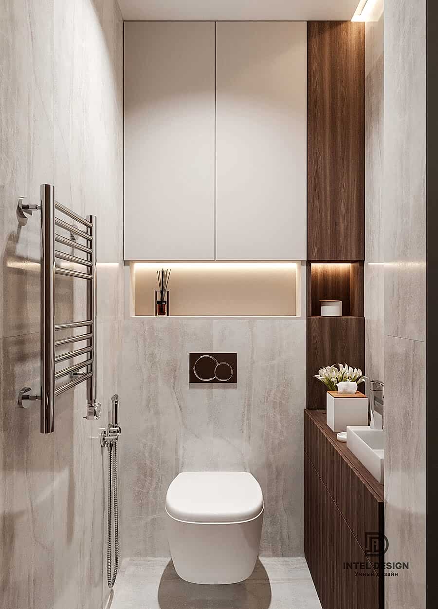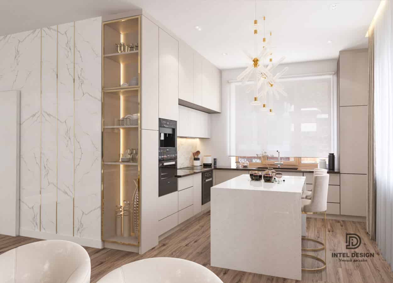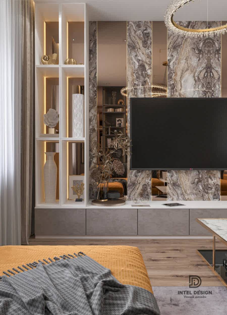 Благодаря Pin-Up глянцевым фактурам, зеркалам, эффектным люстрам и латунным деталям удалось создать торжественное настроение в интерьере. А с помощью бархатистого текстиля получилось сгладить атмосферу и придать этой торжественности домашнего уюта.