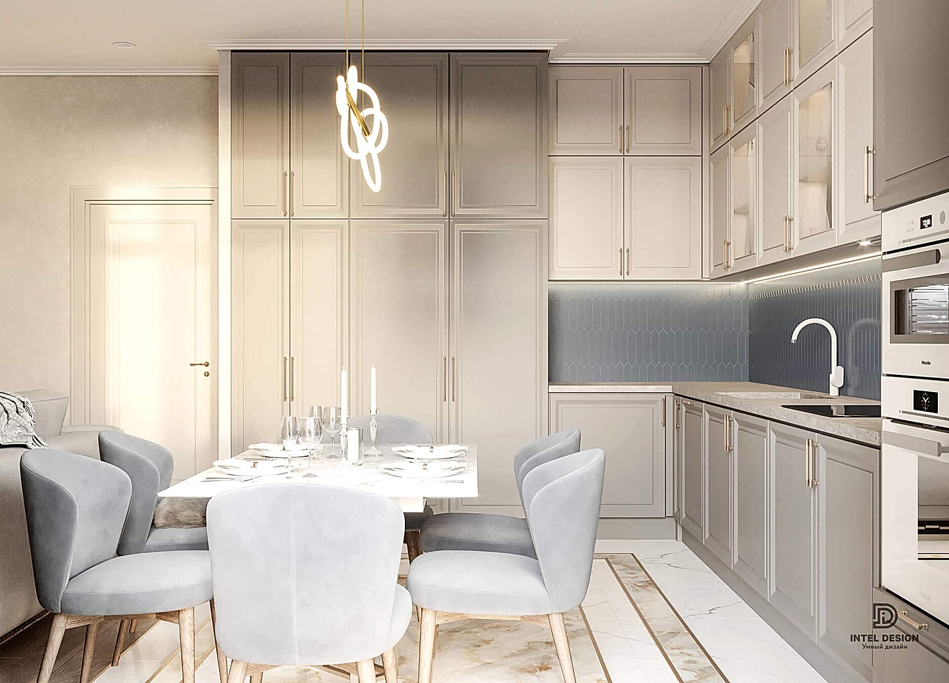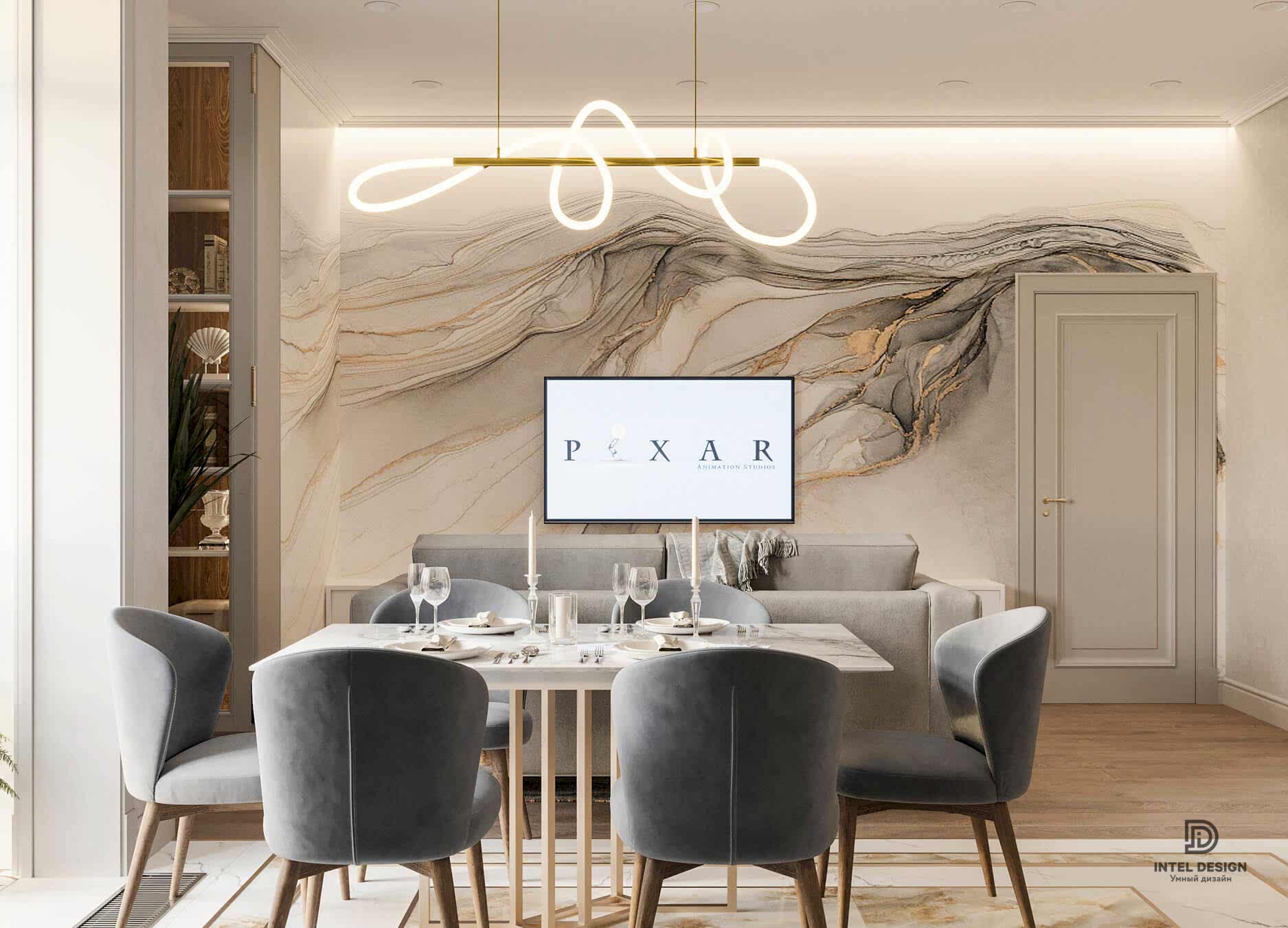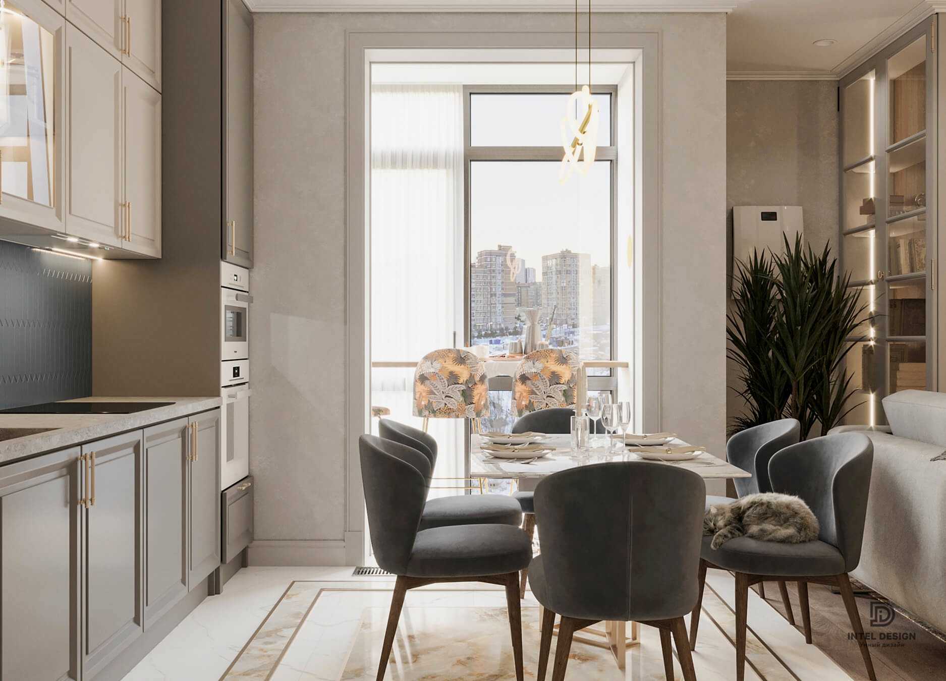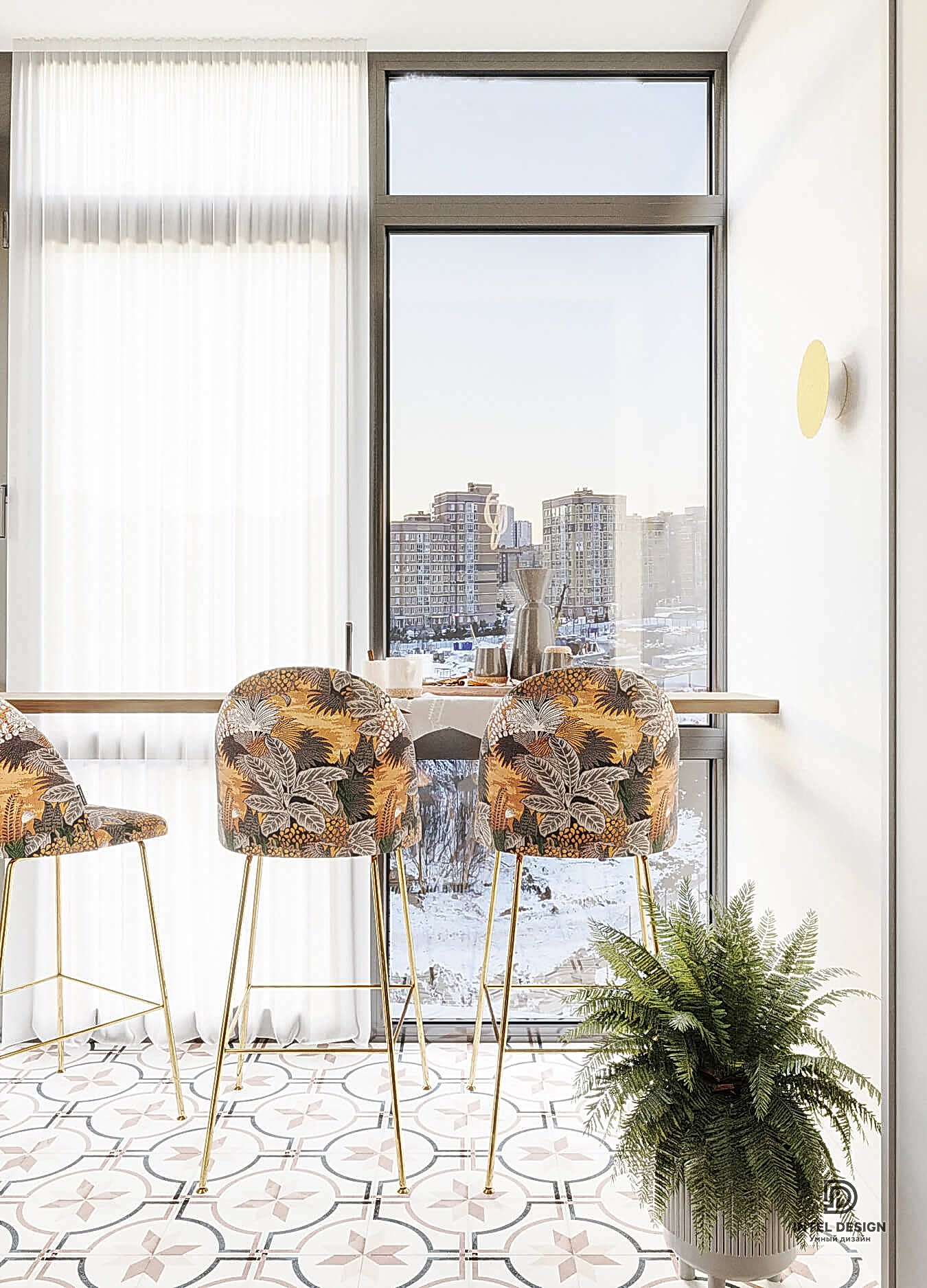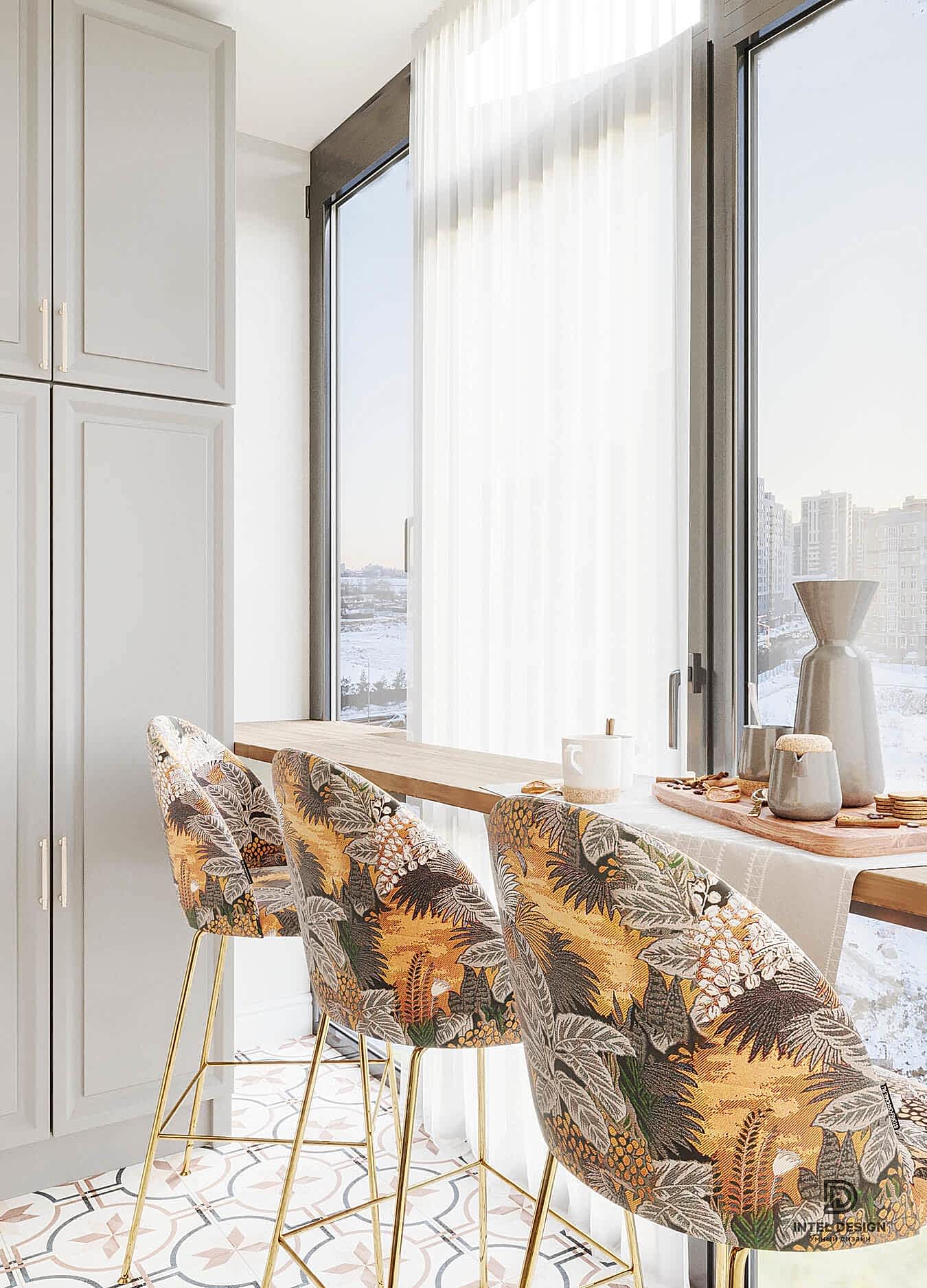 Использование достаточно смелых материалов, таких как фреска, акцентная ткань на стульях и яркая плитка, всегда производят эффект «ВАУ!» при грамотном сочетании. Этот интерьер может похвастаться таким Pin-Up